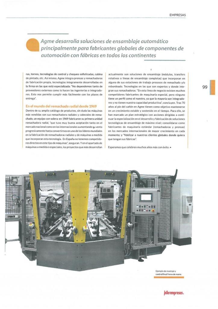 AGME cumple 70 años en el mundo de la deformación y ensamblaje de componentes. Esta experiencia lo ha convertido en un especialista en el diseño y desarrollo de soluciones de ensamblaje automático, así como en la producción de remachadoras, prensas eléctricas e hidráulicas que hoy se pueden encontrar en mercados exteriores consolidados como Alemania, Reino Unido, Francia, Italia y Portugal y otros emergentes como Polonia, República Checa, México y China.